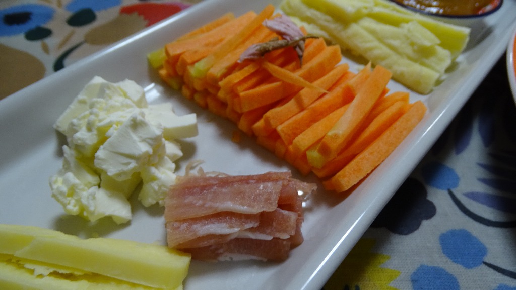 バトネ人参は、生ハムと組ませたり・・・・3種のチーズと組ませたり、ニンニク味噌を
