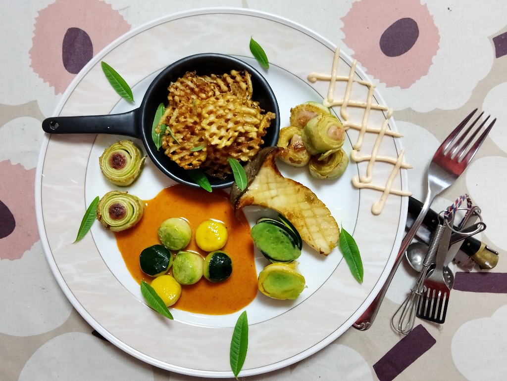 添えは、エリンギのソテーとワッフルポテト ベルベーヌを散らしてます。