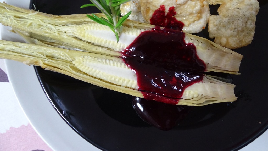 半割で盛り付けてます。蒸し焼きの様なものなので・・・・・ヤングコーンが持っている水分のみで加熱されてます、たまらない香り・・・・無茶苦茶美味しい!!