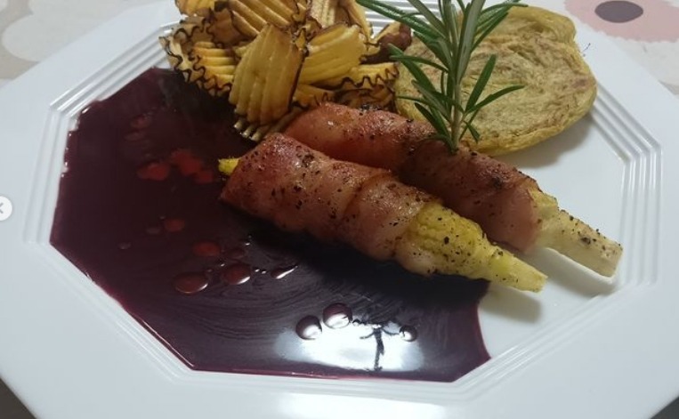 2本は、ベーコンを巻いて・・・1本は、さや付きのロースト用に・・・・