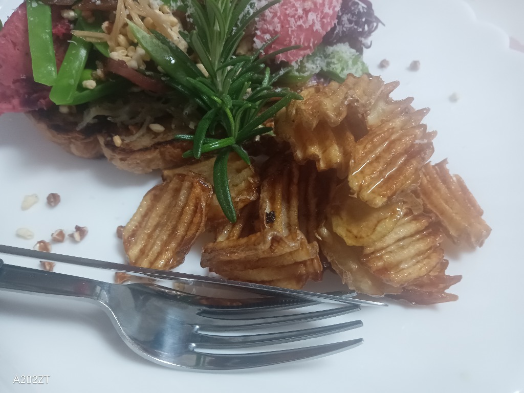 スライスして重ねたポテトを、焼き上げて・・・・冷ましてスライスして再びフリットする。