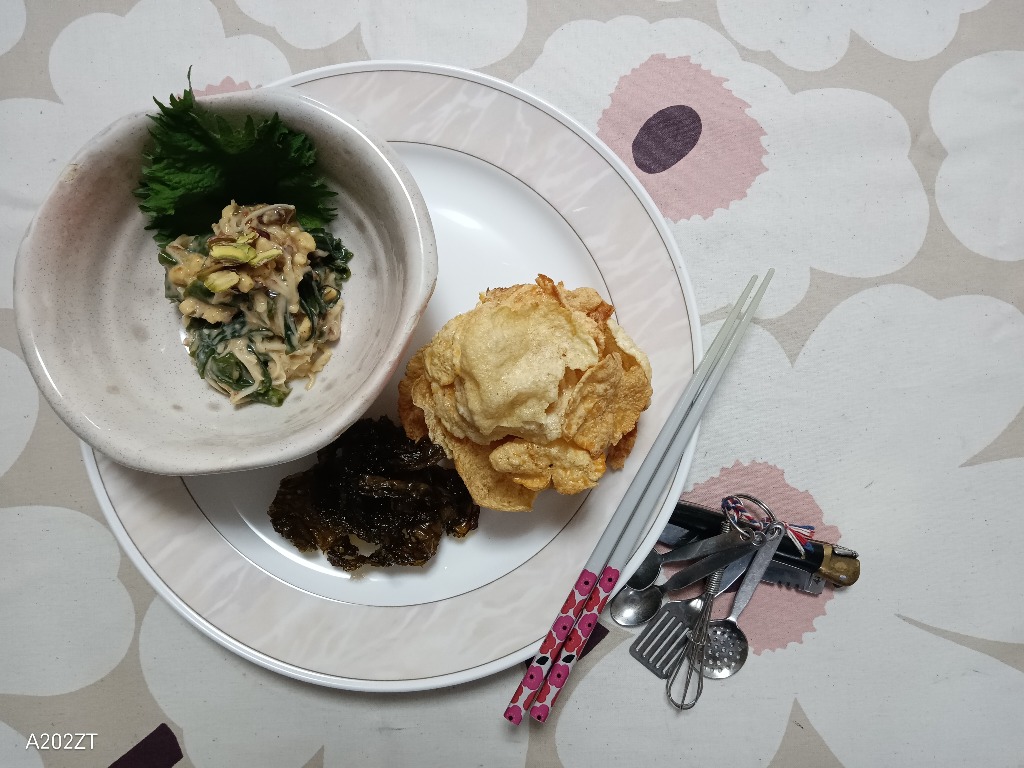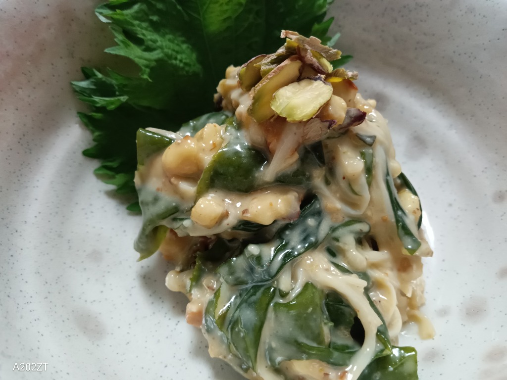 ワカメとnutsの蕗味噌マヨ和え、ウンピンビリンジョウを添えて・・・