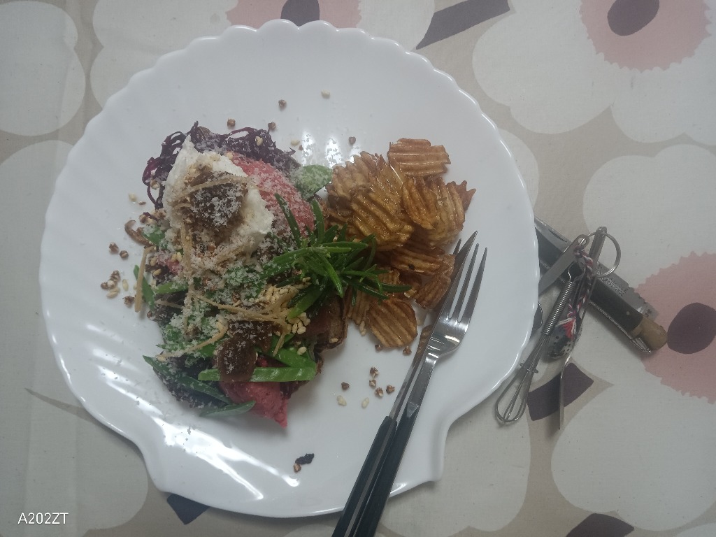 食べた時食感として残るので独特の味わいがある。エストラゴン風味のsalmonや・・・・ポーチドエッグ、クリチ・・・・蓮根やレッドキャベツ、生姜のビネガー漬け、カリカリ食感の、ライスパフ、蕎麦の実、シラス・・・・pinkのポテサラ、次から次へと・・・違う食感が現れ、にやけまくりのプレート。
