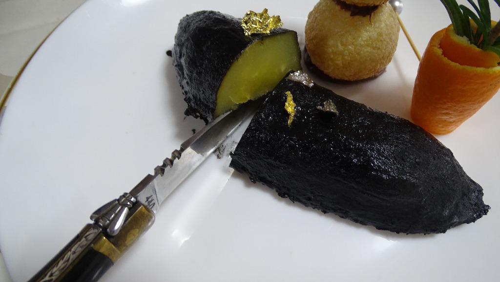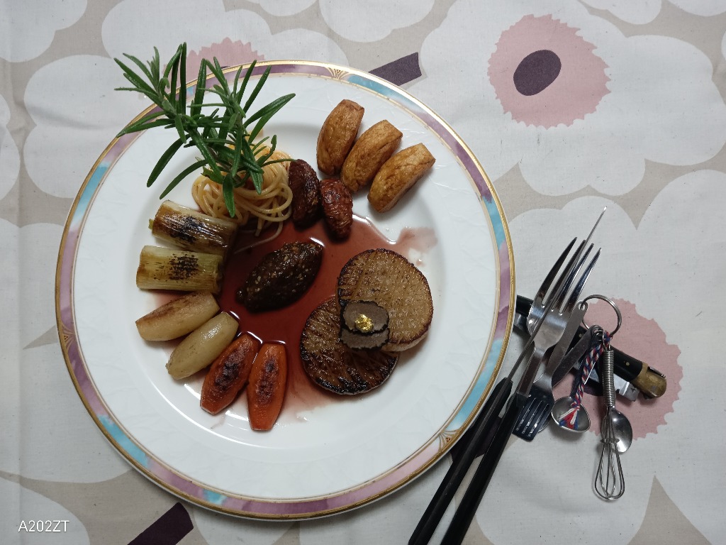 5)大根に赤ワインソースを掛けて、トリュフと金箔をデコります。