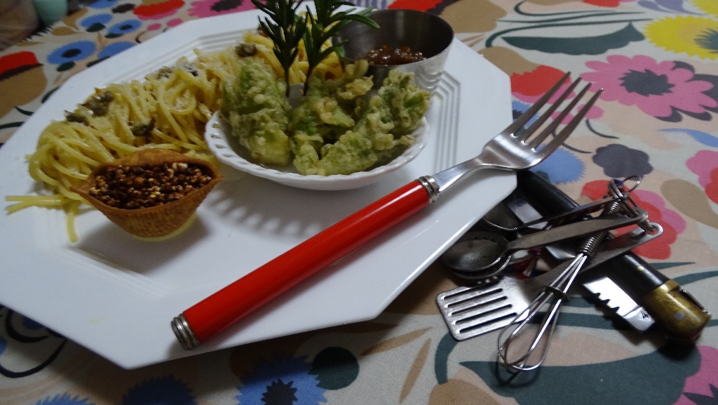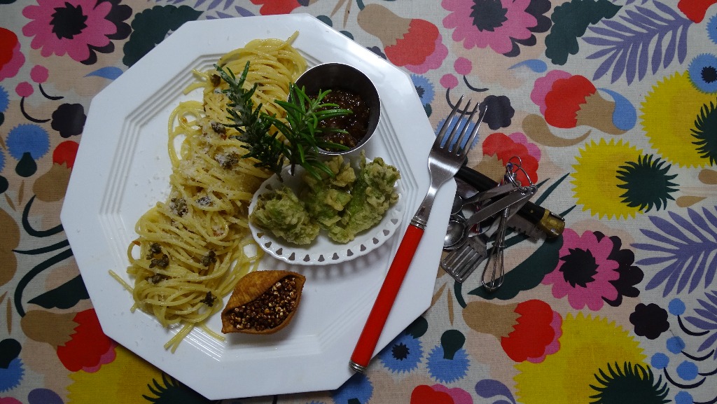 ニンニクとタカノ爪をオリーブオイルで炒めて・・・・アルデンテパスタを加えます、アンチョビペースト、ブラックペッパーで味を調えます。素揚げした、ケッパーとパルミジャーノレジャーノと自家製