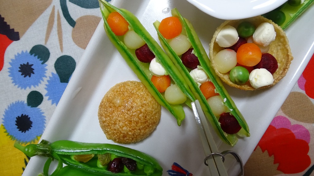 食べられませんが‥‥鞘をケースにして、人参、ポテト、ビーツ、クリチを詰めてます。