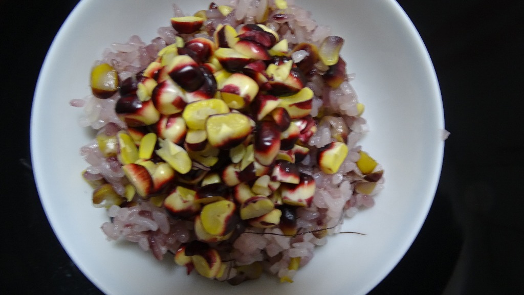 炊きあがり、芯を外すと・・・・パープル色、アントシアニンが出ています。