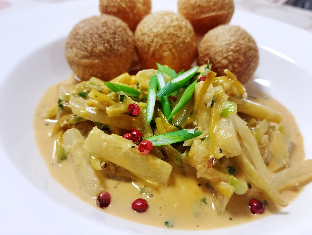 アンチョビ、ニンニク、トマトの美味しいクリームに包まれた大根・・・・歯ごたえのある皮と葉も加え、違う食感を楽しめる、まんま大根を使った一品!!