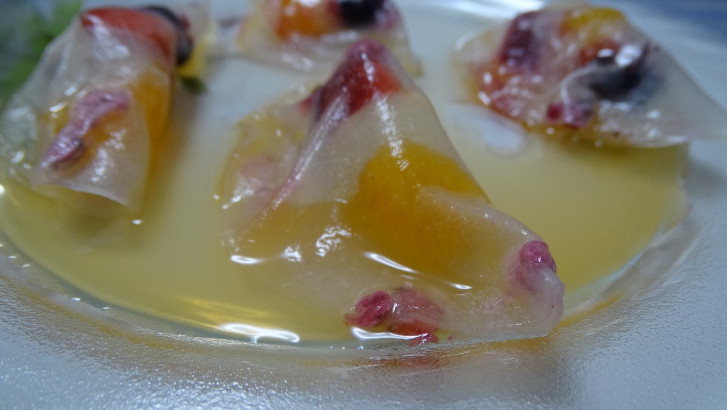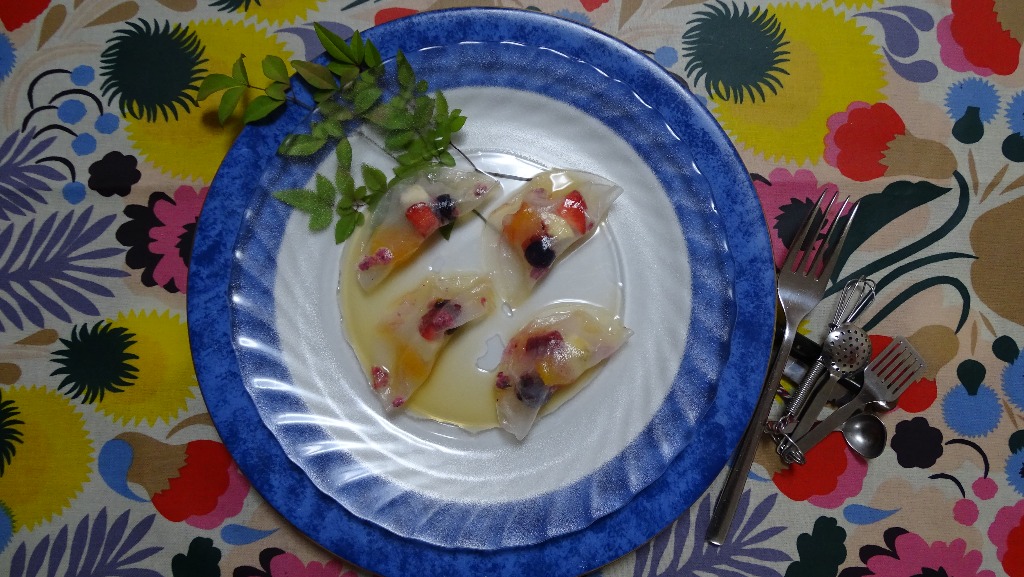 4)ガラスのプレートに載せて、グレープフルーツジュースを少し掛けます。