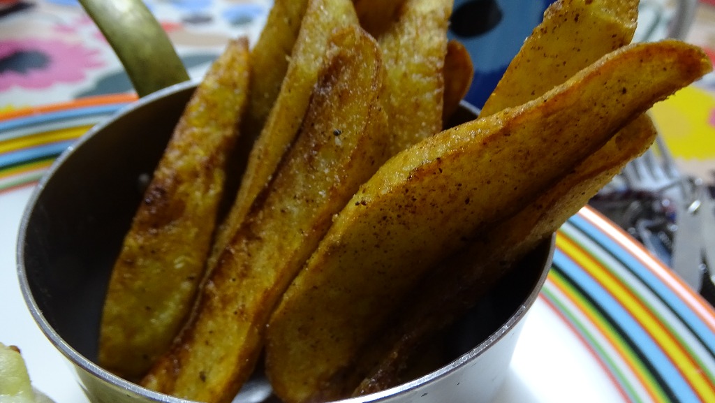 ポテトをチャットマサラ、海老塩、胡椒、片栗粉で・・・・ふりっフリッして揚げて添えました。