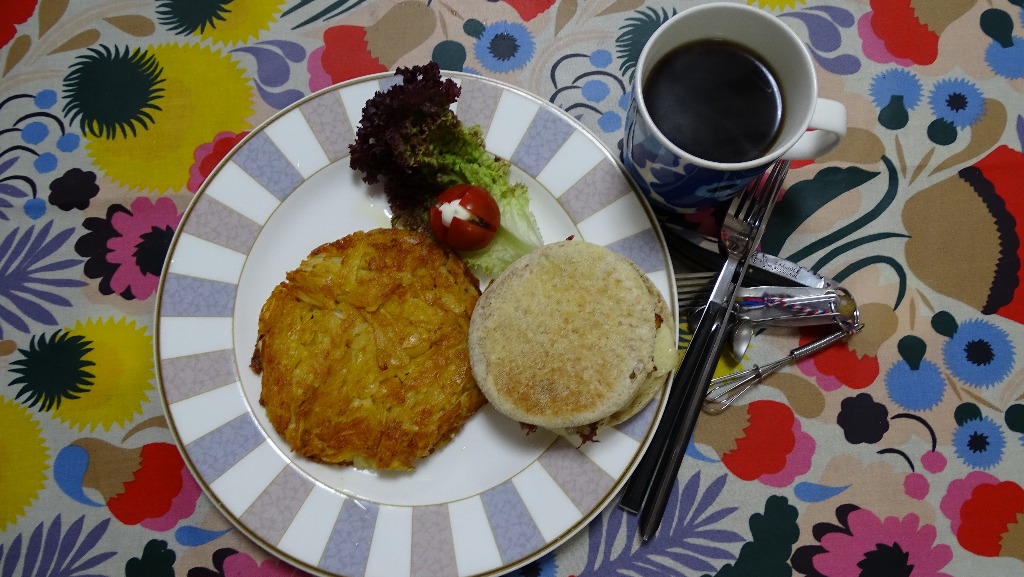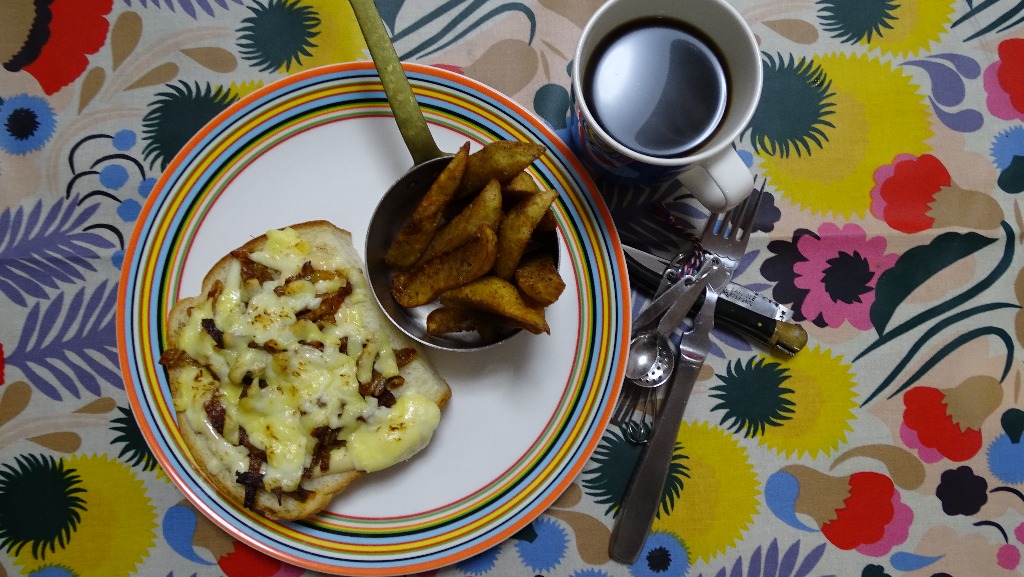 今朝のbreakfast、spicy peau de pouletチーズトースト,マサラポテト添え