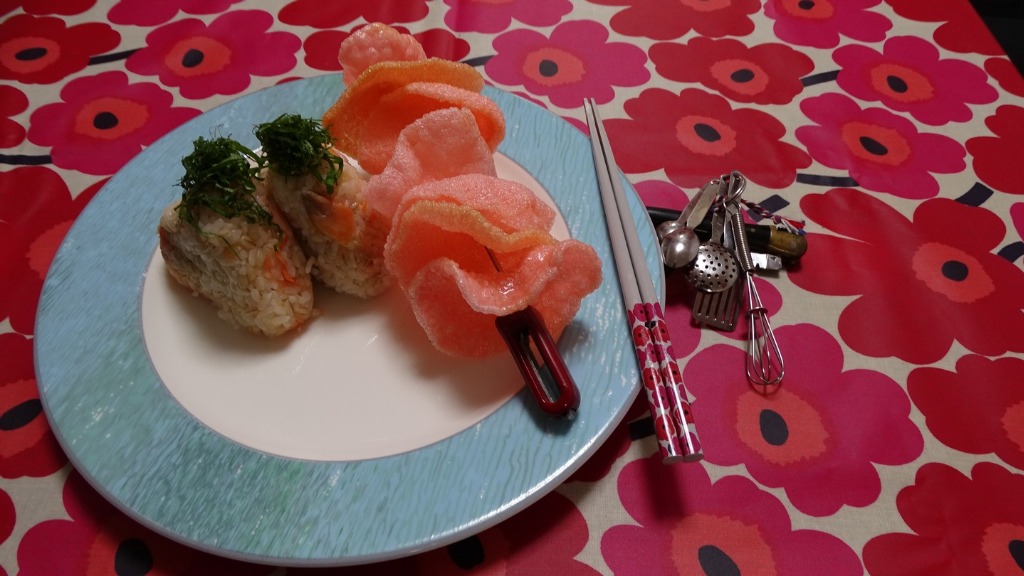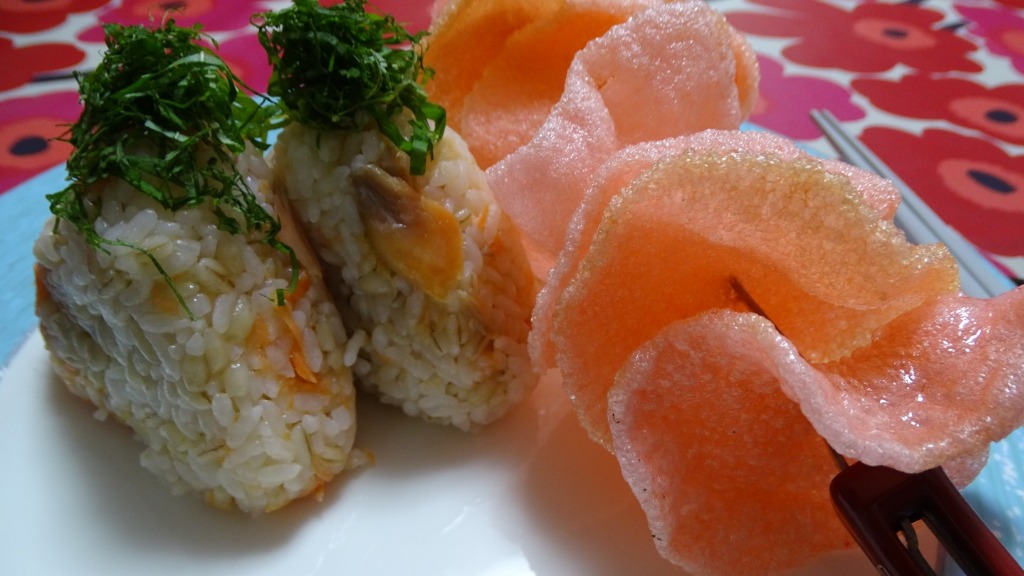 #OnigiriAction 王道!!鮭ては通れない、ハラス握り海老煎餅添え