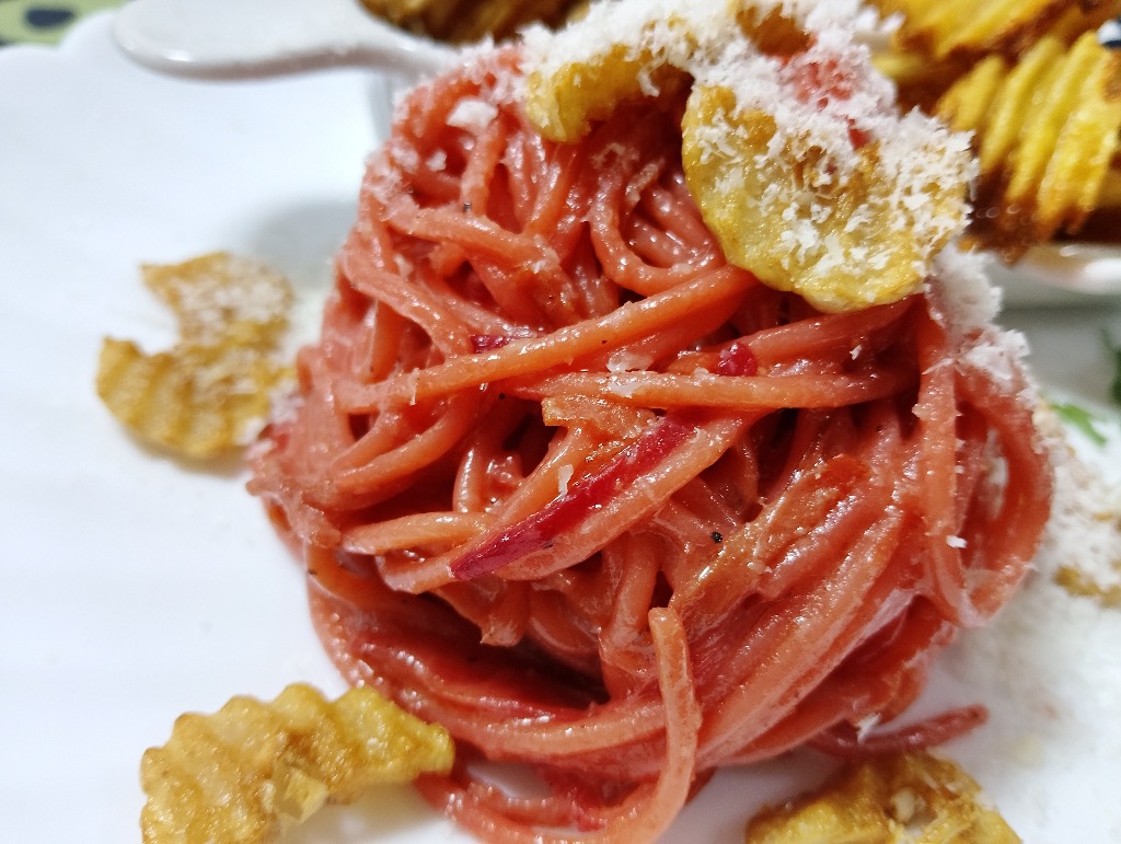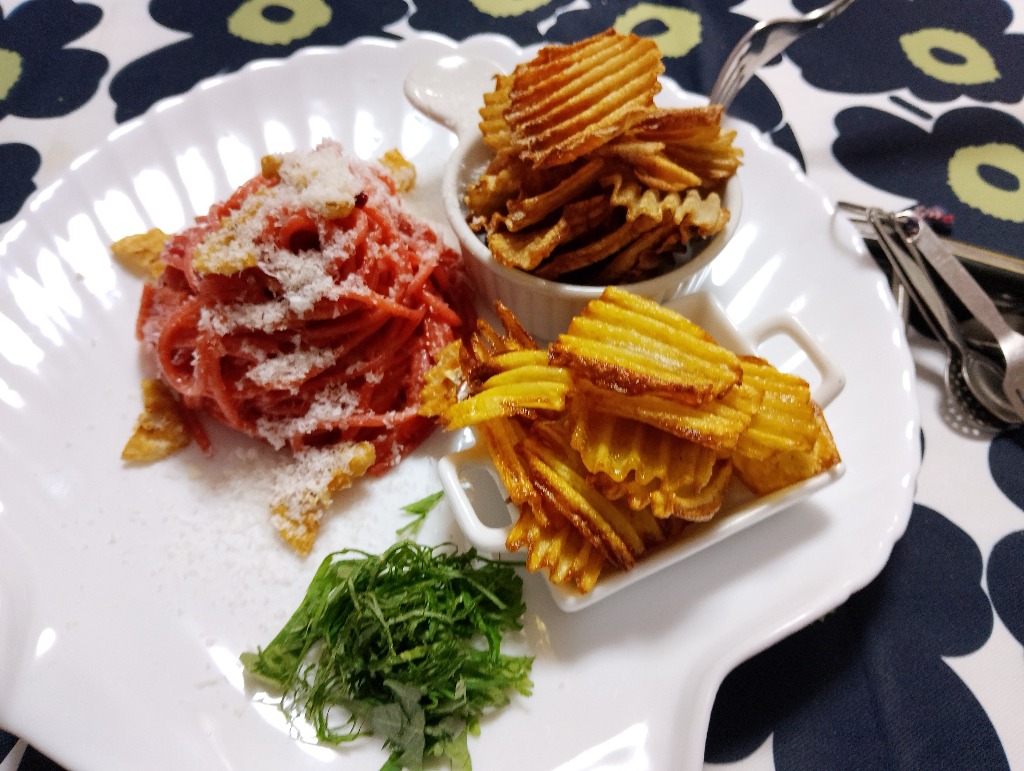 雲丹うにしてないpasta、里芋とアンデスポテトのチップ添え