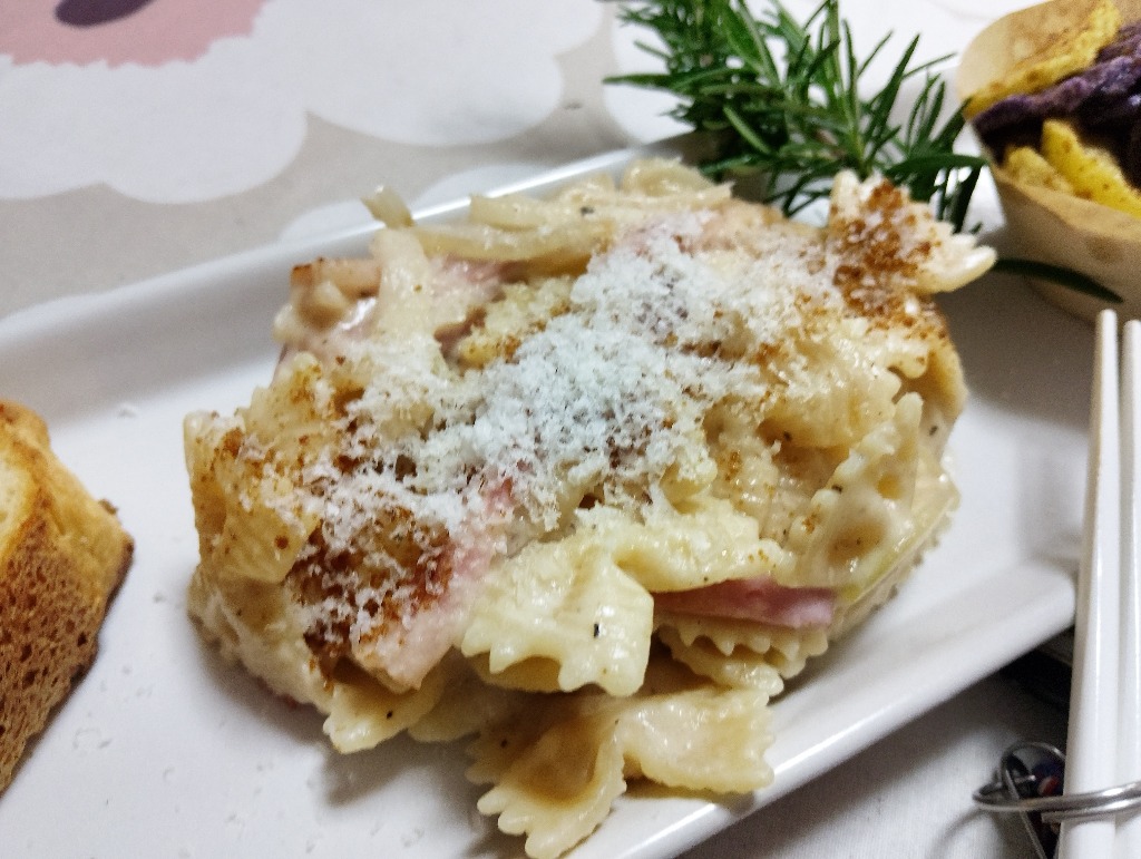 2)玉ねぎ、ベーコンをオリーブオイルでソテーして、Farfalleとソースと生クリーで絡めてblackペッパーで味を調えます。ボッタルガとパルミジャーノをトッピングします。